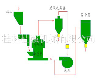 待粉磨的物料通过破碎机破碎,经提升机送至储料斗,可调速的给料机从料斗经罩筒入料口输送到主机腔内。在传动装置的驱动下,中心轴带动着梅花架总成、磨辊总成、铲刀架、铲刀座总成一起旋转,磨辊总成安装在梅花架上, 旋转产生巨大的离心力使磨辊与磨环紧贴在一起,物料在铲刀座总成作用下,不断把物料铲送至磨环、磨辊间,磨环和磨辊在相对旋转运动中在离心力的作用下不断对物料进行碾压、挤压、冲击。对物料进行粉碎细化。 粉碎后的粉体在气流的带动下上升到分级区域,由涡轮分级机进行气体与粉体分离,经涡轮分级机分离出的合格粉体通过管道送至双旋风收集。不合格的粉体降回主机,并被再次碾压破碎,直至合格。